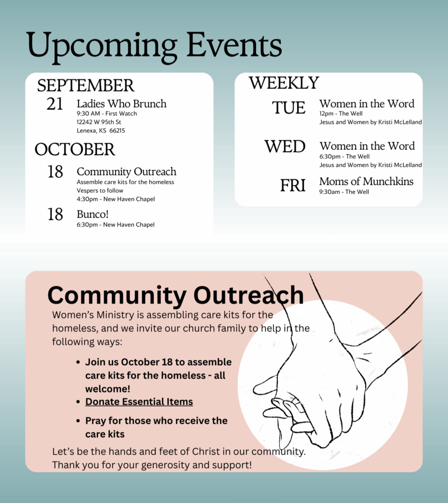 New Haven’s women’s ministry is Project GROW: Guiding Relationships and Outreach to Women. We seek to create a space for women to connect to others by fostering relationships and by providing ways to serve and encourage each other on our personal journey with God. Our ministry is a safe place where everyone belongs.